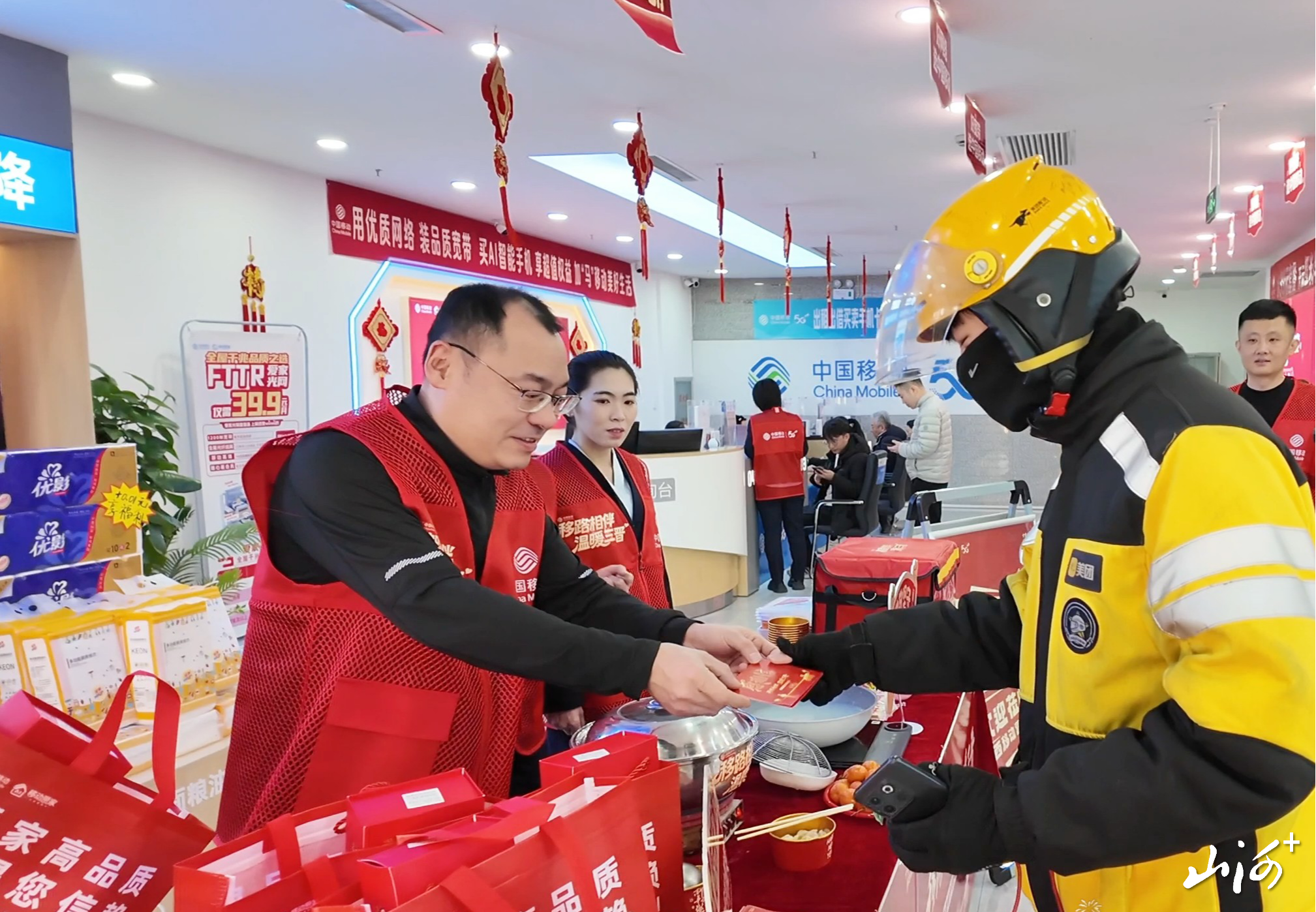 与此同时,山西移动遍布全省城乡的119家营业厅全面升级为“暖心驿站”,张灯结彩的营业厅内年味浓郁,工作人员邀请环卫工人、外卖小哥、执勤警察走进“驿站”,不仅提供饺子、饮水、充电的便民服务,还有急救药品等应急物资,让奔波在外的坚守者卸下疲惫,在欢声笑语中品热饺、话团圆,感受“家”的温情与归属感。