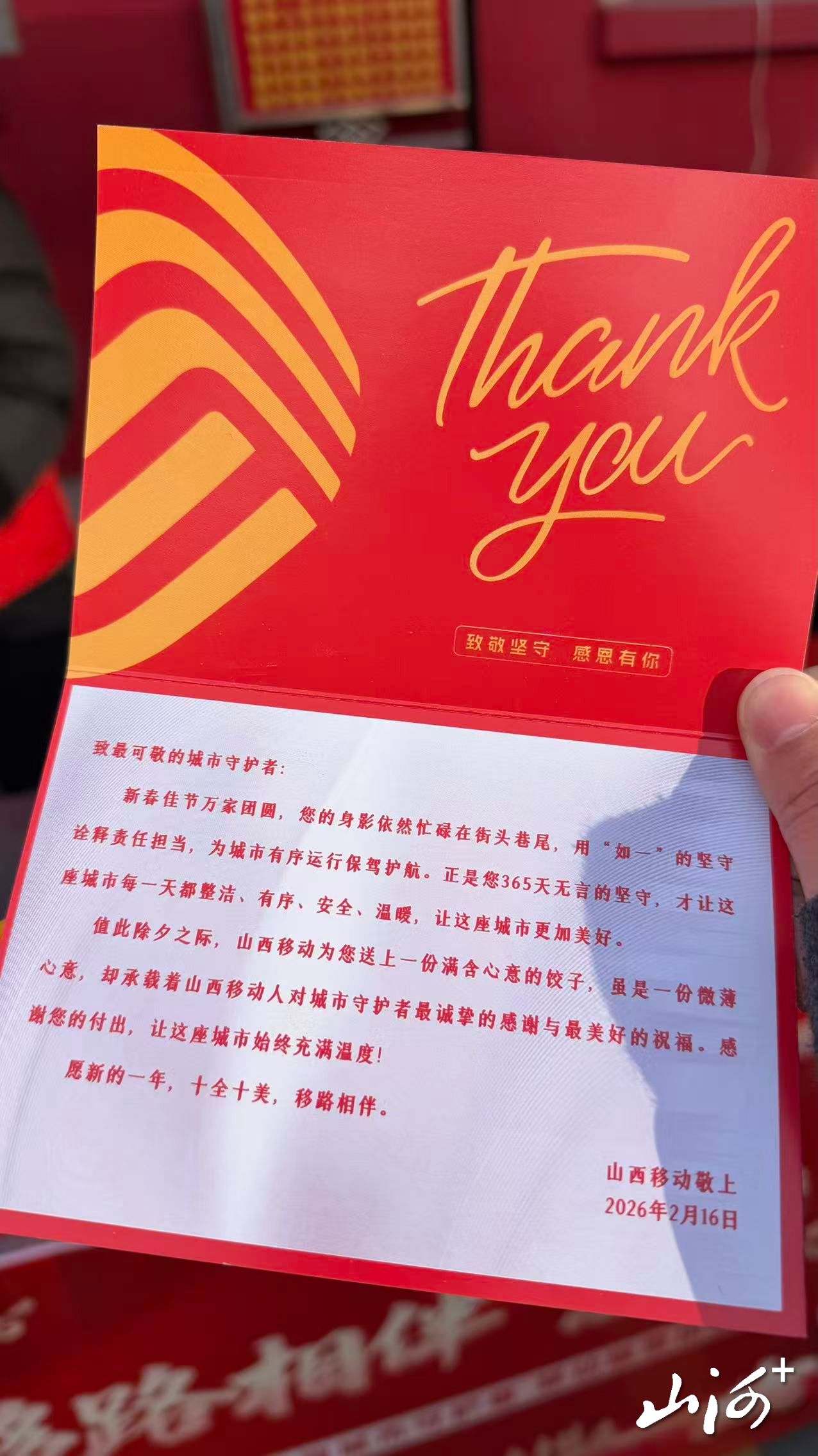 新春启序,万象更新。2026年马年春节万家团圆之际,中国移动山西公司(以下简称“山西移动”)启动“移路相伴,温暖三晋——一碗暖心饺”公益行动,覆盖全省11个地市及所有区县,通过“线下暖心驿站+外场精准派送”双向服务模式,为环卫、消防、交警、外卖小哥等户外及公共服务坚守者送去新春暖意,以实际行动传递人文关怀,践行企业社会责任与公益担当。
