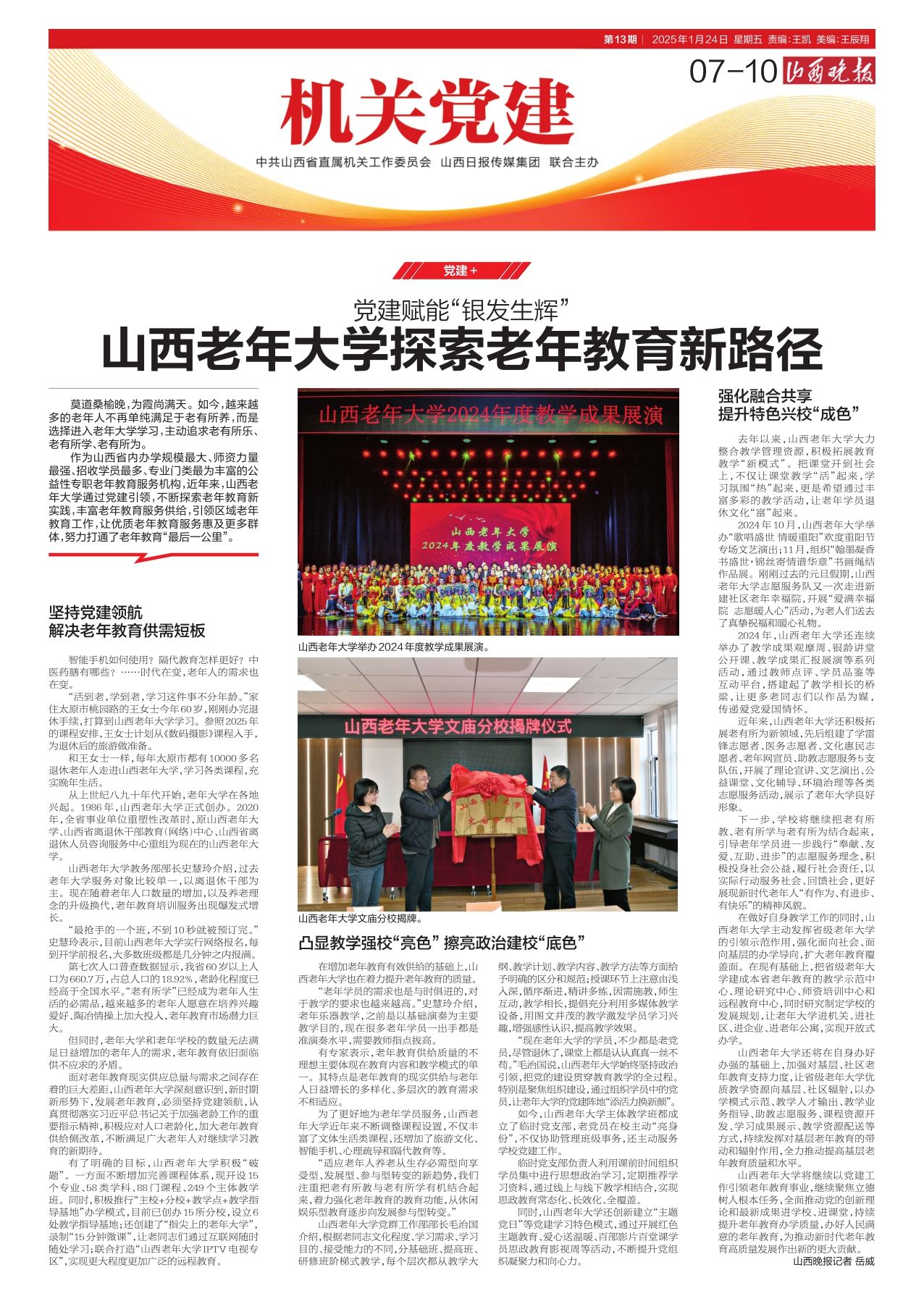山西老年大学将继续以党建工作引领老年教育事业,继续聚焦立德树人根本任务,全面推动党的创新理论和最新成果进学校、进课堂,持续提升老年教育办学质量,办好人民满意的老年教育,为推动新时代老年教育高质量发展作出新的更大贡献。