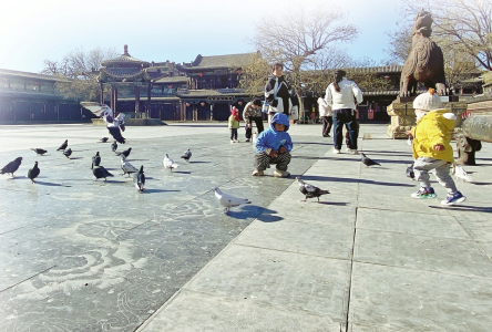 时值周末,记者随人潮漫步老城,感受着改造升级后的变化。东大街广场上,成群白鸽盘旋、啄食,引来孩童阵阵欢笑。不远处的热门打卡墙,国风生肖装饰与古街老巷相映成趣,吸引游客驻足拍照。青石板路上,不时走过几位身着特色服饰的游客,为冬日老城平添几分动人色彩。