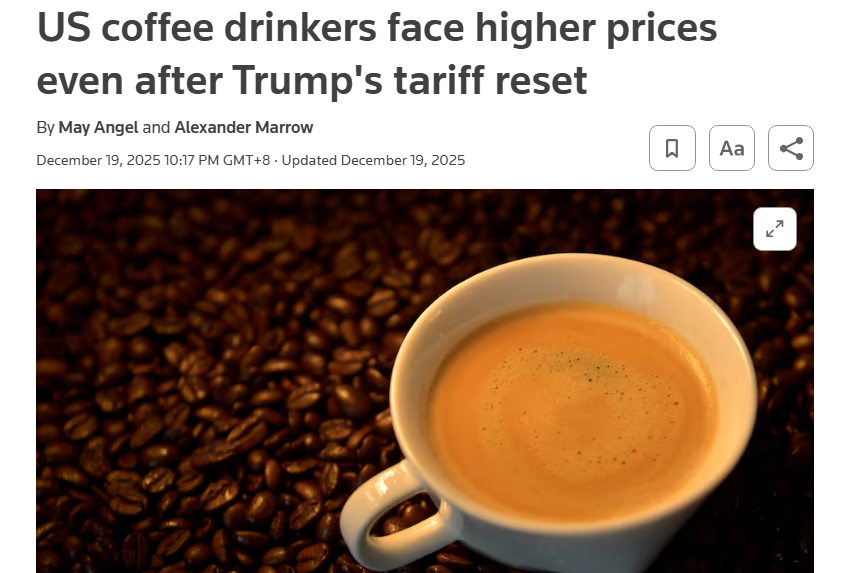 报道提到,今年11月,在民主党赢得新泽西、纽约和弗吉尼亚等州的选举胜利、选民对食品价格不满情绪上升的背景下,本届美国政府撤销了对咖啡等200多种“难以在美国本土生产”的食品征收10%至41%所谓“对等关税”。