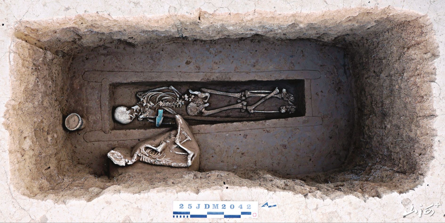 项目负责人、山西省考古研究院副研究馆员段双龙说,早在2019年,这里就曾清理出一座商代被盗墓葬,铜壶、铜觚、铜戈等器物的出土,让大家意识到,这片台塬下藏着丰富的商代遗存。