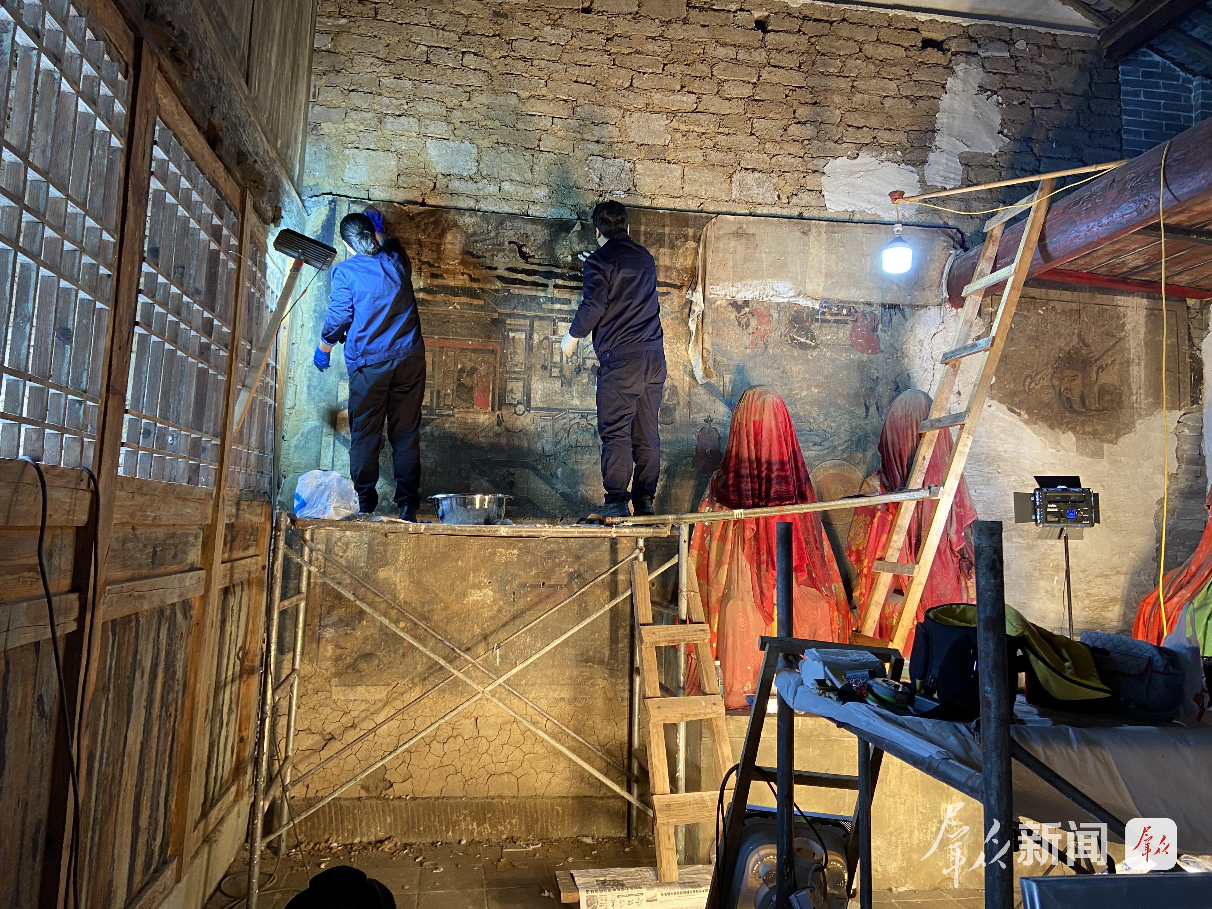 2025年7月,陕西省文物保护研究院(陕西省文物鉴定研究中心)工作人员修复东岳庙壁画(资料照片)。 受访者供图