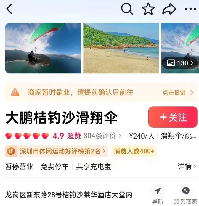 涉事商家在网络平台上的名称为“大鹏桔钓沙滑翔伞”,经营地址位于深圳市大鹏新区桔钓沙莱华酒店大堂内。记者查询大众点评和抖音平台发现,该商家目前已暂停营业。