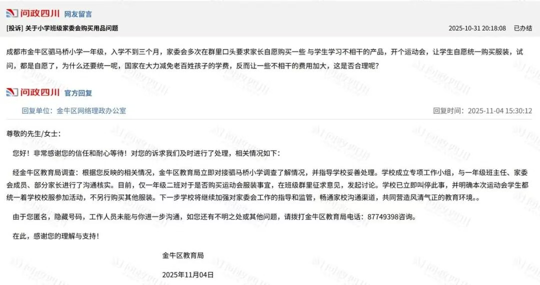 山西晚报·山河+记者注意到,该网友于10月31日在“问政四川”平台投诉“关于小学班级家委会购买用品问题”,质疑家委会在班级群中组织家长购买服装是否合理,并指出:“既然强调自愿,为何又要求统一?国家正着力减轻家庭教育支出负担,此类无关开销反而增加了家长压力。”