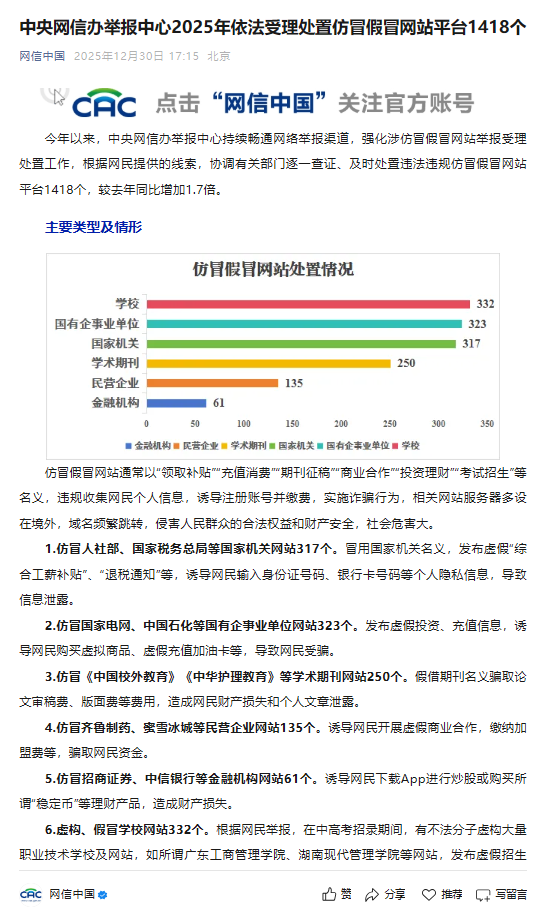 在此提醒广大网民提高警惕,如发现仿冒假冒网站,可通过中央网信办举报中心官网(https://www.12377.cn)或相关属地网信举报部门官网举报,共同守护清朗网络空间。