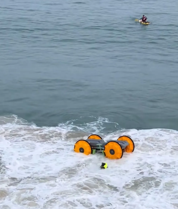 据悉,事件发生于4月18日17时40分许。根据网友发布的现场视频显示,当时有两台水陆两栖沙滩车在近岸海域行驶,其中一台突遭一道巨浪拍击,车身瞬间失控,侧翻入海。一名游客被海浪冲击力甩出车厢,其余三人被困于倒扣的车体内。险情发生后,岸边待命的救生员立即跳入海中施救,多艘摩托艇迅速驰援,现场工作人员不断喊话确认被困人员状态。画面显示,4名游客均按规定穿戴救生衣,最终全部被成功救上岸。