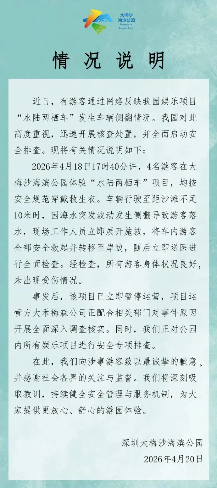 针对此事,大梅沙海滨公园于4月20日发布情况说明:4名游客在体验“水陆两栖车”项目时,均严格遵守安全规范穿戴救生衣。车辆行至距沙滩不足10米处时,因突遇海浪冲击导致侧翻,游客落水。现场工作人员第一时间实施救援,迅速将全部人员转移至安全区域,并安排送医进行全面检查。经医院诊断,4名游客均无外伤,身体状况良好。