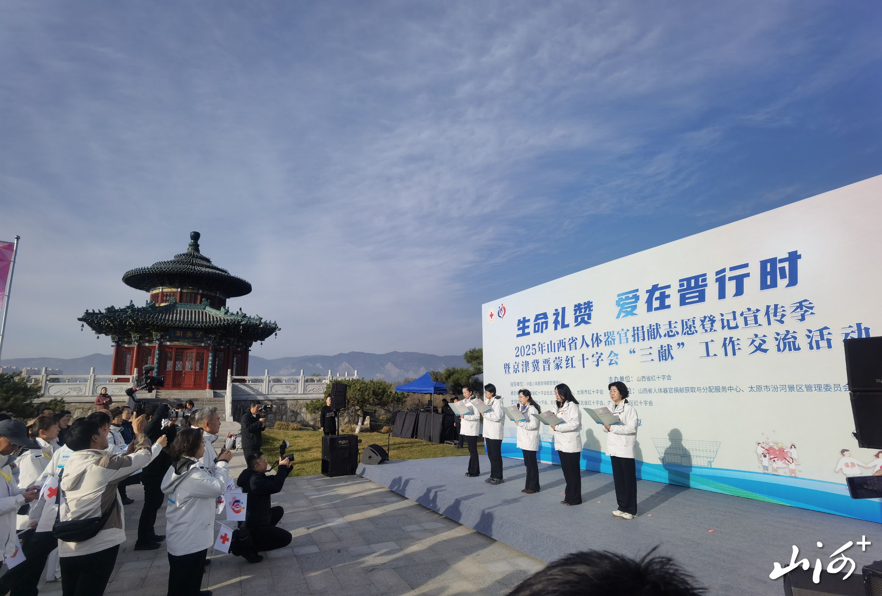 山西晚报·山河+讯 11月12日9时,太原汾河公园四期望岳阁,“生命礼赞·爱在晋行时”——山西省人体器官捐献志愿登记宣传季暨京津冀晋蒙红十字会“三献”工作交流活动在太原圆满落幕。活动以健步行践行公益初心,以工作交流共促事业发展。
