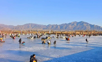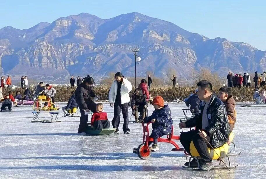 活动现场,广阔的冰面之上,人声鼎沸,欢声笑语此起彼伏,成为一片欢乐的海洋。冰上自行车、滑冰车、雪地摩托等丰富多样的冰雪项目吸引了众多游客参与。孩子们坐在色彩鲜艳的冰车上,手持冰钎奋力滑行,在冰面上划出一道道灵动的轨迹;大人们则三五成群,或陪伴左右,或在冰面步道上漫步赏景,或组队体验冰上竞技的乐趣。远处的恒山巍峨耸立,与近处的冰面相映成趣,构成了一幅绝美的山水画卷。