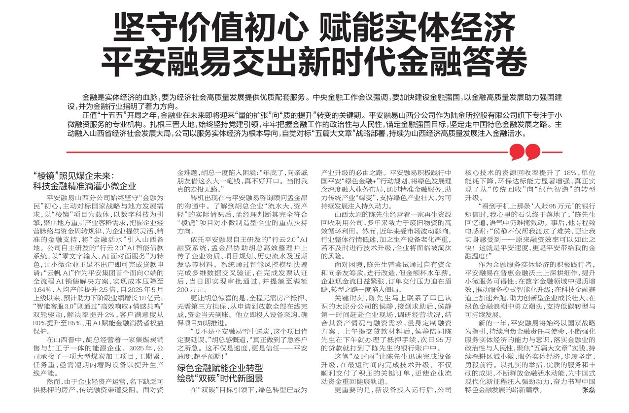 平安融易山西分公司始终坚守“金融为民”初心,主动对标国家战略与地方发展需求,以“棱镜”项目为载体,以数字科技为引擎,聚焦地方重点产业客群需求,把握企业经营脉络与资金周转规律,为企业提供灵活、精准的金融支持,将“金融活水”引入山西各地。公司自主研发的“行云2.0”AI智能借款系统,以“零文字输入、AI面对面服务”为特色,让小微企业主足不出户即可完成贷款申请;“云帆AI”作为平安集团首个面向C端的全流程AI 销售解决方案,实现成本压降至1.64%、人均产能提升2.5倍,自2025年5月上线以来,预计助力下阶段业绩增长18亿元;“智能客服3.0”则通过“高效响应+情感共鸣”双轮驱动,解决率提升2%,客户满意度从80%提升至85%,用AI赋能金融消费者权益保护。