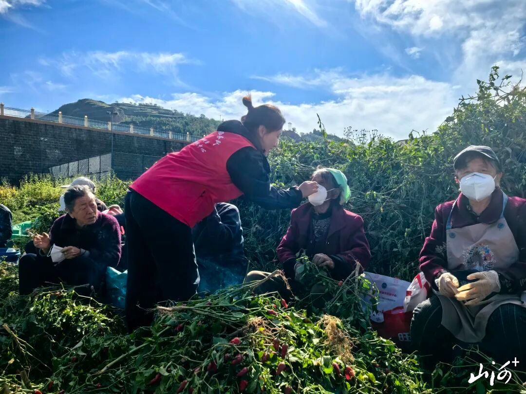 正值石楼县辣椒采收的关键时节,田间地头随处可见忙碌的身影,其中不少是务工增收的老年农户。考虑到秋季天干风大,采摘辣椒时老人易吸入粉尘,且长时间户外劳作需加强健康防护,两支部提前筹备、精准对接,为老人们准备了包含N95口罩等物资的“关爱包”。
