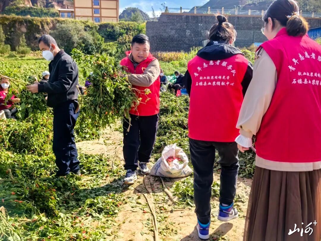 山西晚报·山河+讯 金秋十月,椒香满田。10月15日,吕梁市石楼县青年志愿者协会党支部联合石楼县双林单采血浆有限公司党支部,以“金秋十月传党情 敬老爱老暖人心”为主题,来到辖区辣椒采摘点,开展了一场集“送关怀、保健康、助丰收”于一体的联合志愿活动,为田间劳作的老年采摘户送去温暖。