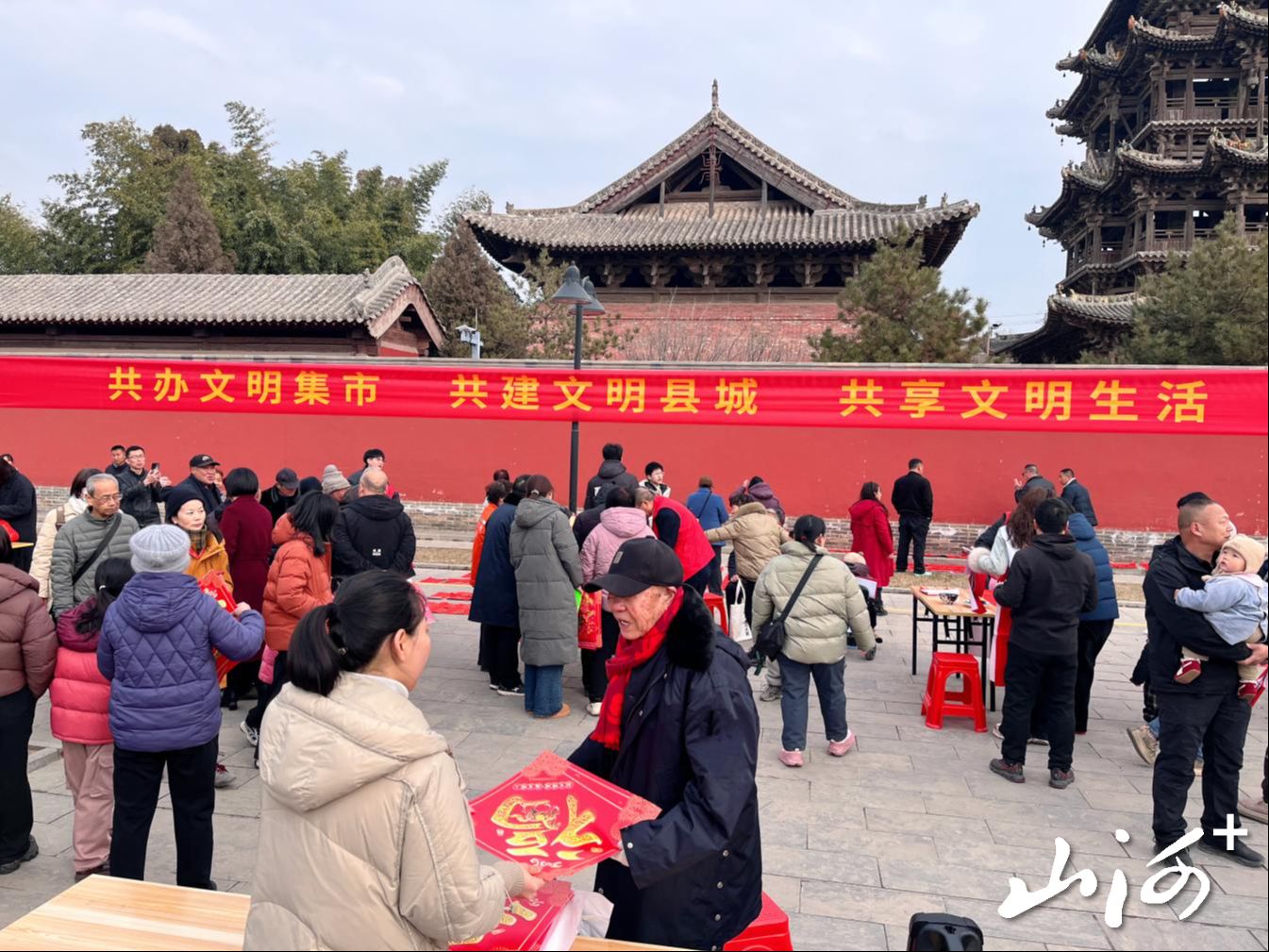 山西晚报·山河+讯 骏马迎春至,文明暖荣光。2月9日,运城市万荣县委宣传部在历史悠久的飞云楼旁,组织举办了“共办文明集市 共建文明县城 共享文明生活”文明实践主题活动。一场充满温情与年味的“文明集市”在午后暖阳中热闹开市,将贴心服务与文明新风送到群众身边,奏响了新春的序曲。