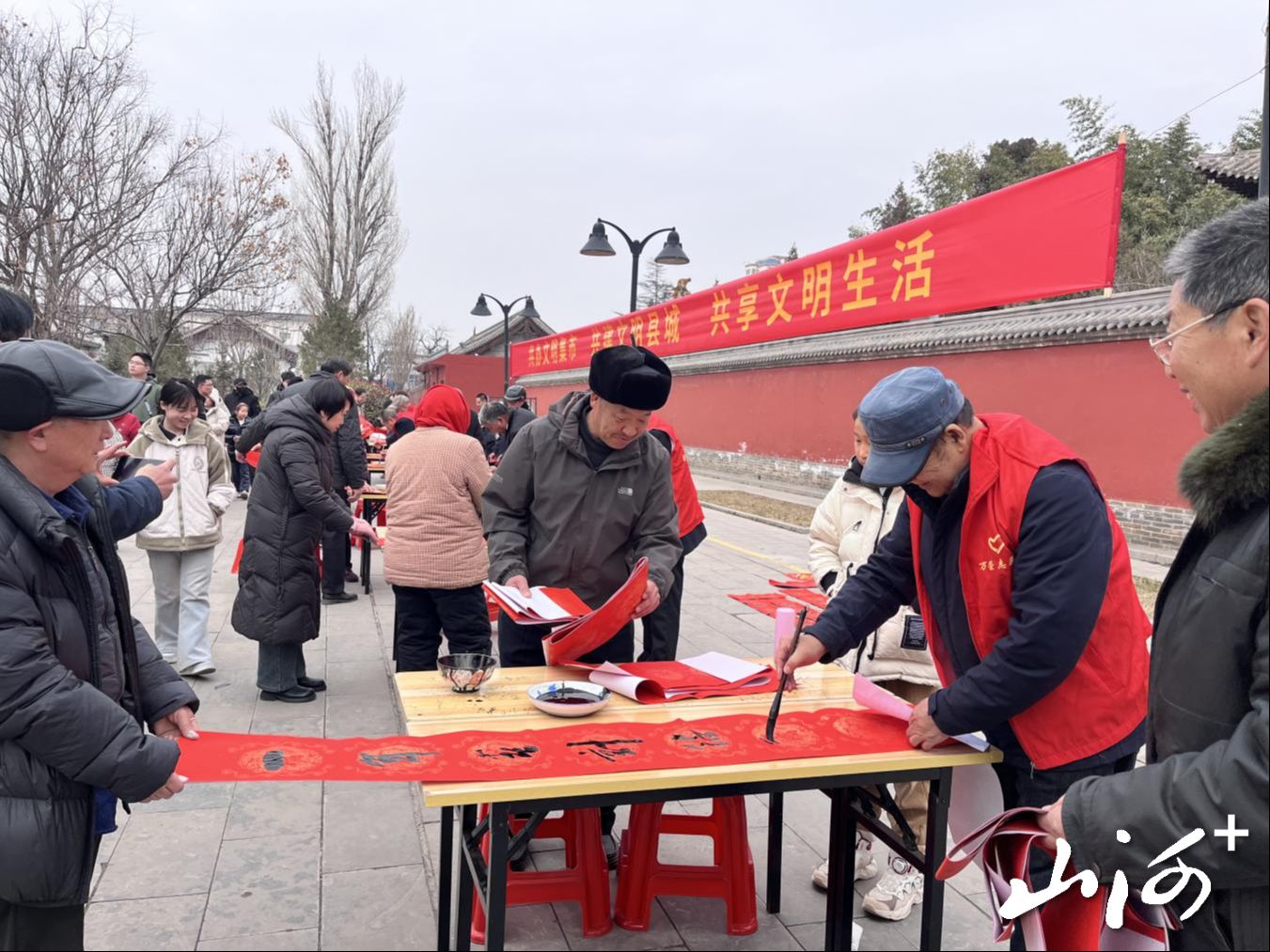 活动现场以“笔墨迎春”为核心,“义写春联”与“送福进万家”两个摊位最为红火。万荣县文联书法家们铺纸研墨,应居民点题挥毫,一副副蕴含马年吉祥寓意和时代新风的春联跃然纸上。“送福进万家”摊位集中发放融合了城市标识与文明标语的精美“福”字帖,将新春祝福与共建文明县城的理念一同送入千家万户。