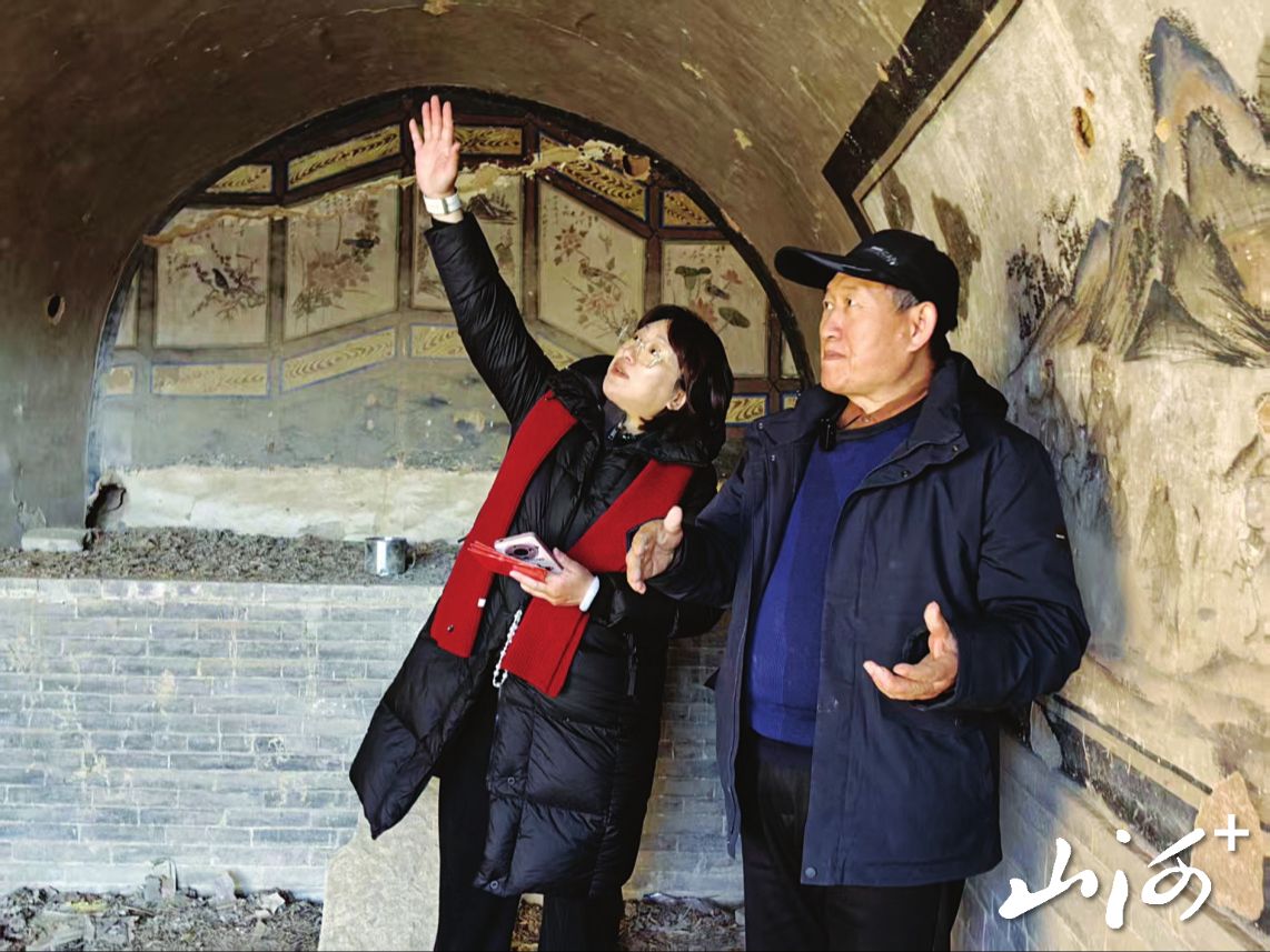 窑洞内,运城市文物专家李百勤(右)和山西晚报·山河+记者孙轶琼为大家讲述壁画内容。山西晚报·山河+记者 王勇摄