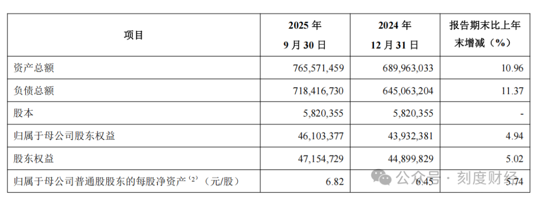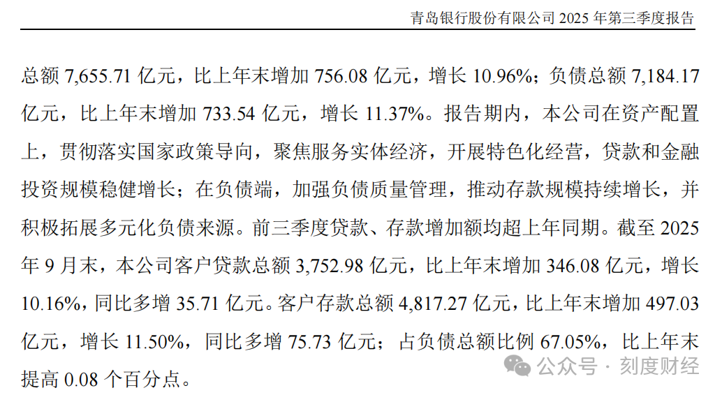 截至2025年9月末,青岛银行资产总额达7655.71亿元,较上年末增长10.96%;负债总额7184.17亿元,增长11.37%。
