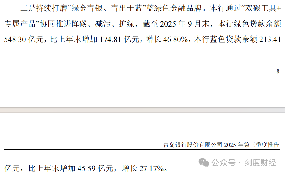 截至2025年三季度末,相关贷款余额较期初均实现增长,其中绿色贷款余额同比增长46.80%,蓝色贷款余额增长27.17%,特色业务初具规模。