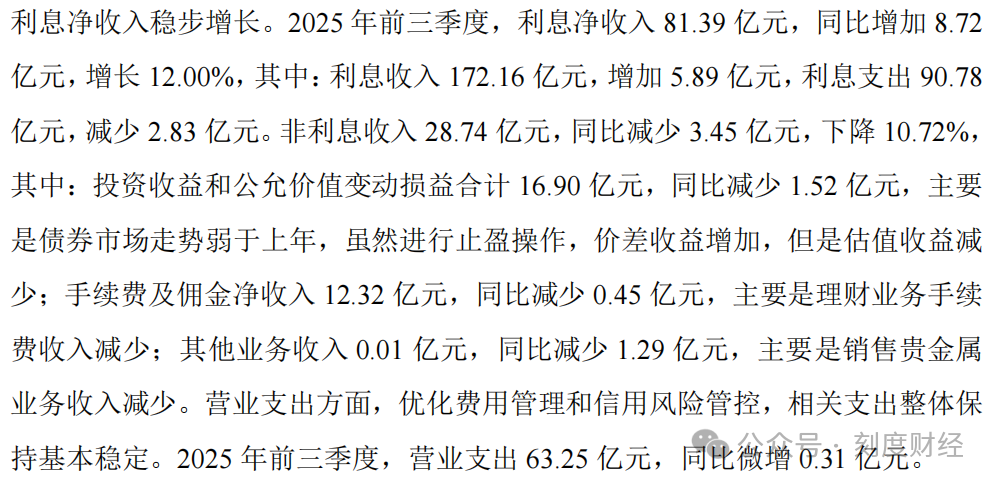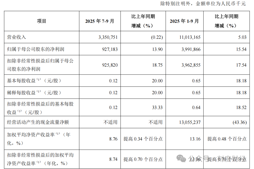 盈利方面,该行前三季度实现营业收入110.13亿元,同比增长5.03%;归母净利润39.92亿元,同比增幅达到15.54%,利润增速显著高于营收。