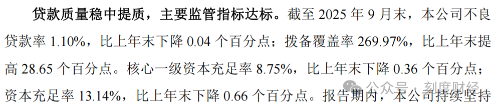 资产质量保持稳定优化态势。三季度末不良贷款率1.10%,较上年末下降0.04个百分点;拨备覆盖率大幅提升28.65个百分点至269.97%,风险抵补能力增强。