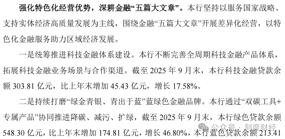 截至2025年三季度末,特色业务已初具规模,相关贷款余额较期初均实现增长,其中绿色贷款余额同比激增46.80%,蓝色贷款余额增长27.17%,科技金融、普惠金融等领域也稳步推进。