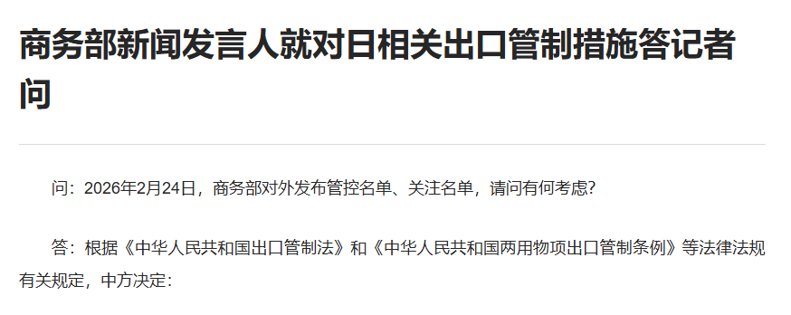 问:2026年2月24日,商务部对外发布管控名单、关注名单,请问有何考虑?