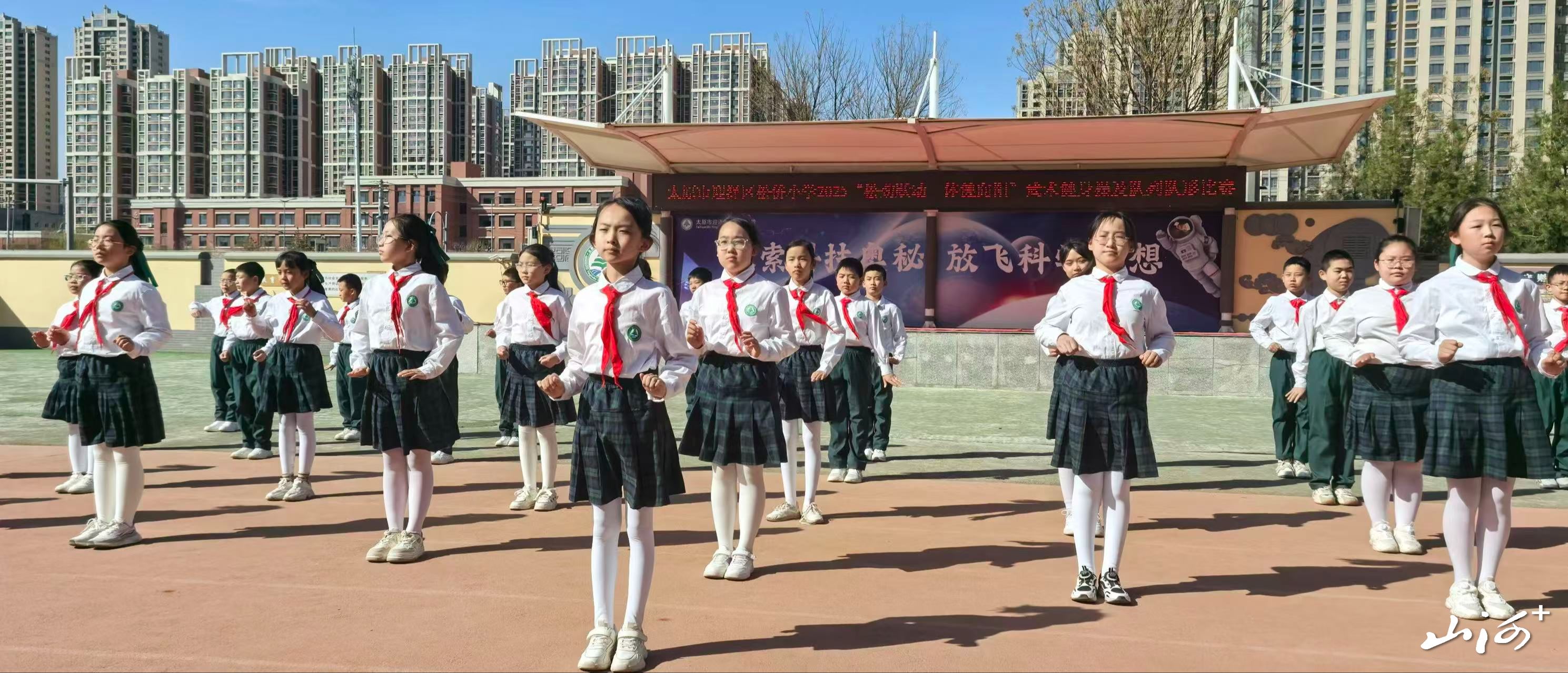 太原市迎泽区松侨小学的操场上,同学们在认真练习八段锦。