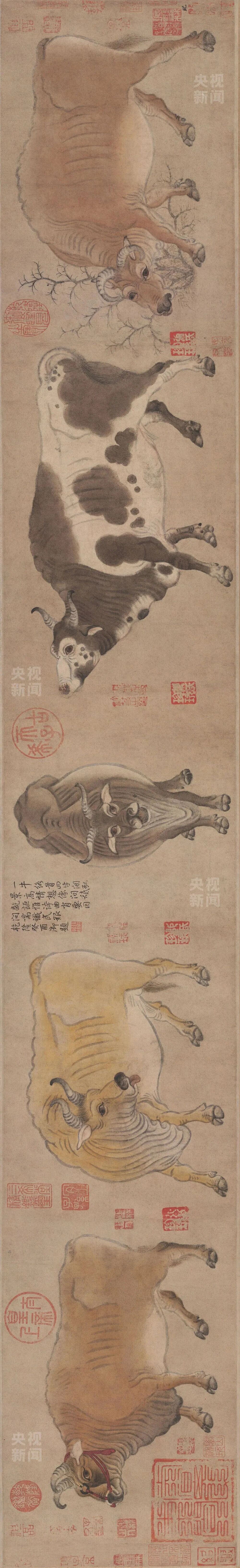 《五牛图》历经颠沛流离,入藏时画面伤痕累累,蒙满尘垢,画心与托纸多处分离,残破程度令人揪心。经过极为复杂的修复装裱工序,画作最终恢复了往日风采。