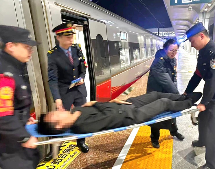 “列车上有医生吗?4号车厢有旅客突发疾病!”11月6日19时25分,就在G2406次列车即将进入长治南站时刻,一阵急促的广播声划破了车厢的宁静,一名旅客突发疾病,情况危急。客运值班员马婕接到列车长需紧急交接一名心脏不适旅客的通知。马婕立即将这一情况快速上报给长治南站站长原亚楠。危急时刻,长治市第三人民医院急诊科护士师龙凤挺身而出,凭借专业的急救技能与温暖的陪伴,抓住黄金抢救期,保住了患者生命。