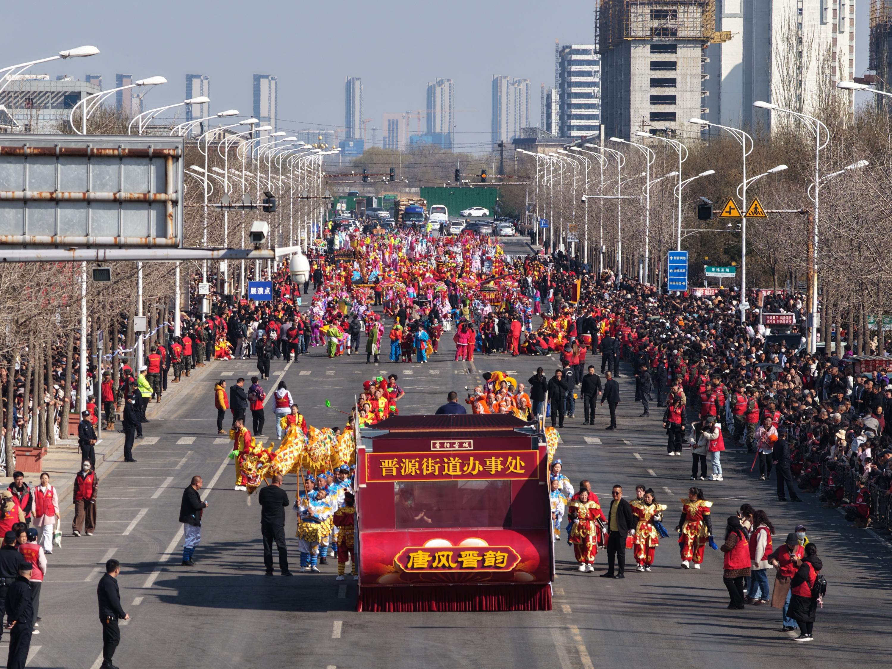 鼓声刚歇,披红挂彩的晋源彩车缓缓驶来,车首古城巍峨,车身绘就太山胜景与青山绿水,将千年文脉与现代农旅完美交融。晋阳龙灯精彩亮相,金色巨龙腾空而起,舞龙队员闪展腾挪、矫若惊龙,长龙蜿蜒盘旋、腾跃翻滚,引得观众阵阵喝彩。憨态可掬的狮子摇头摆尾闯入人群,或直立仰视、与孩童逗趣,或就地打滚、乐翻全场。市民轻抚狮头祈福,一句“摸摸狮子头,万事不用愁”,让吉祥喜气扑面而来。