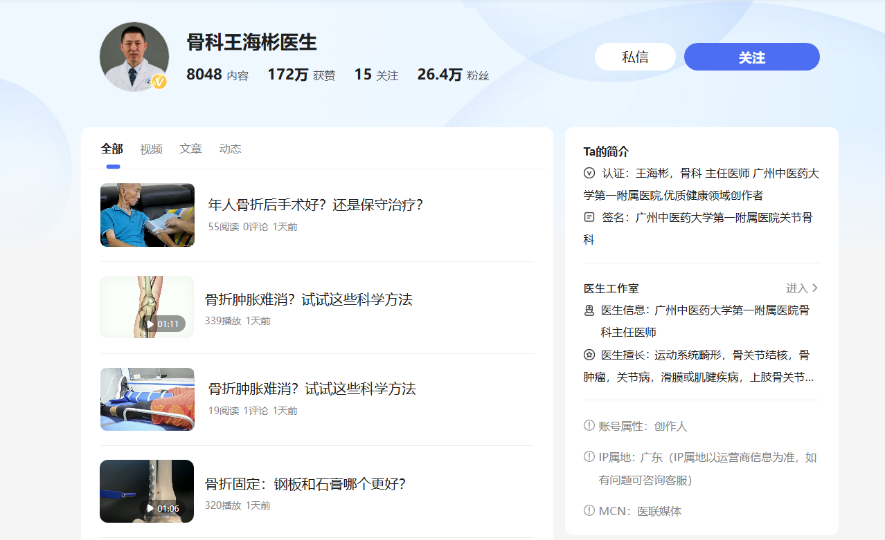 百度健康信息显示,王医生患友评分为5.0,累计发布1.8万条科普内容。他在多个社交平台设有医学科普账号,其视频号最新一条视频更新于9月21日。