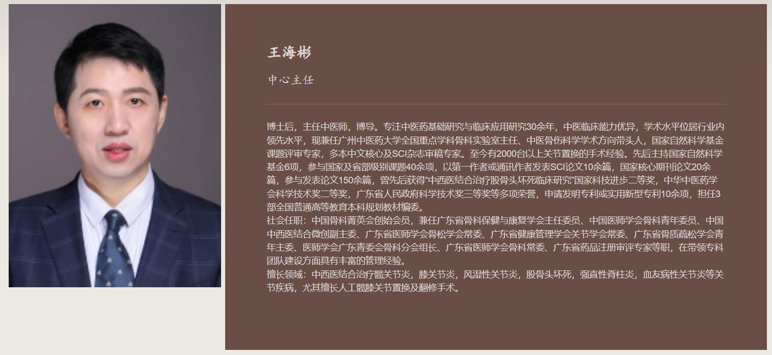 广州中医药大学第一附属医院官网显示,王海彬,男,1971年4月出生于山东,博士、博士后、博导,为该院骨科主任中医师。他专注中医药基础研究与临床应用研究30余年,临床能力突出,学术水平在行业内领先,擅长中西医结合治疗髋关节炎、膝关节炎、风湿性关节炎等关节疾病,尤其擅长人工髋膝关节置换及翻修手术,至今已完成2000台以上关节置换手术。