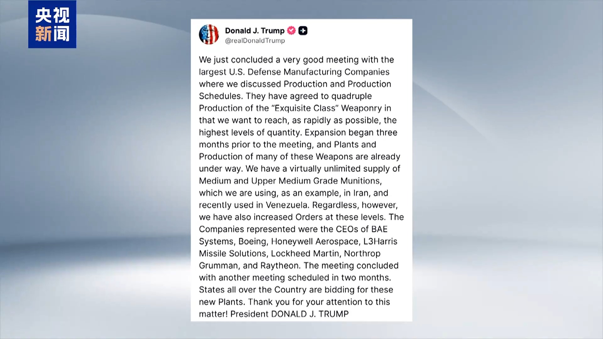 美国总统特朗普6日在社交媒体发文称,已与波音、洛克希德- 马丁、诺思罗普- 格鲁曼等美国军工巨头召开会议,商讨提升武器产量事宜。特朗普称,与会企业已经同意增加产量,目前多款武器的生产线已全面投产。