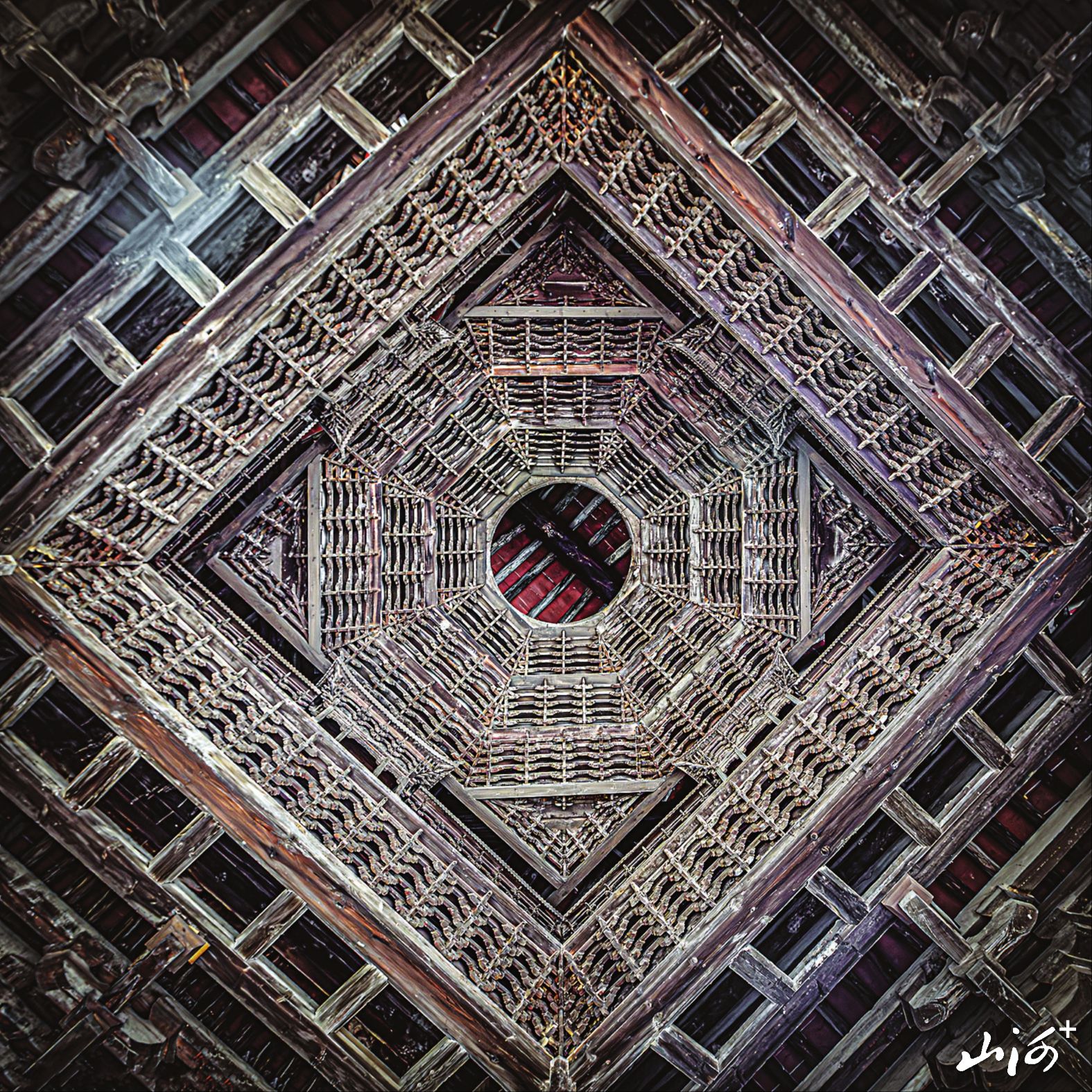 献殿天花藻井堪称奇观,由斗拱递叠而就,融天圆地方、楼阁烟火、易经八卦于一体,玲珑别致,疏朗奇巧。