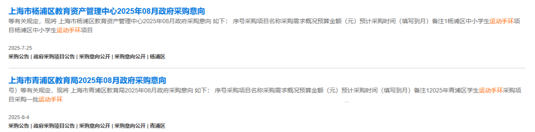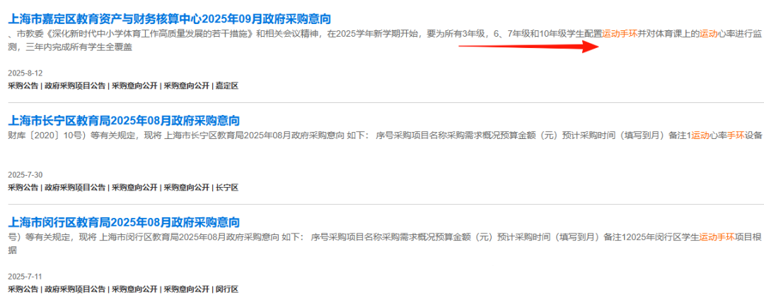 截至目前,在上海市政府采购网,包括嘉定、静安、青浦、长宁、普陀、徐汇、松江、杨浦、金山、黄浦、奉贤、闵行等12个区教育局公布学生运动手环及其配套设备采购意向公告。上海闵行区采购公告显示,手环需支持实时上传心率数据、存储48小时数据、拓展校外活动监测等功能。