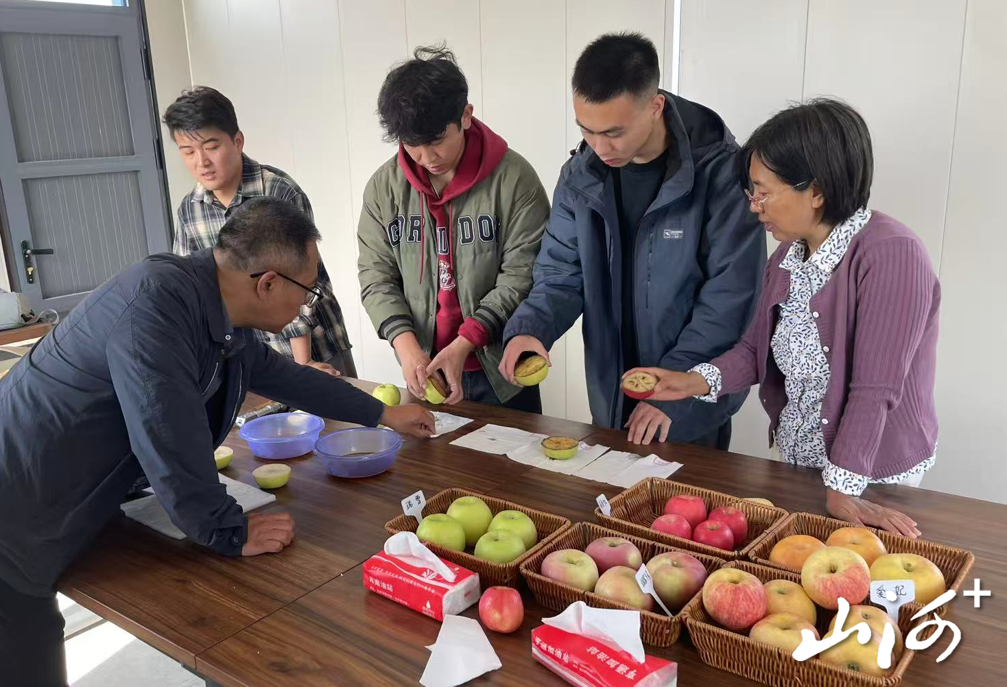 10月13日雨水停歇后,山西农业大学园艺学院师生与合作社负责人王广毅迅速投入苹果采收工作。团队通过室内淀粉染色、外观色泽检测、可溶性固形物分析及口感品尝等专业手段,精准确定“鸡心果”“瑞雪”等不同品种的采收时间节点,保障果实品质。