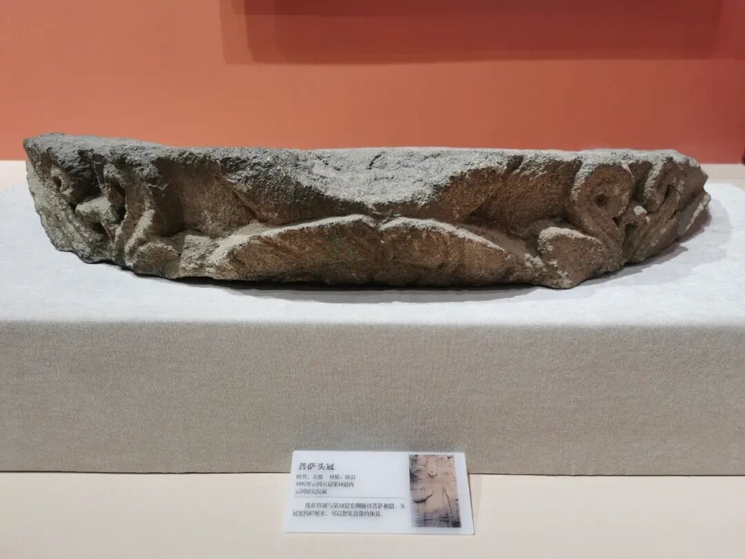 这是一件收藏于云冈博物馆。这件仰月菩萨冠饰直径约87.5cm、高约 11cm,仰月最外围直径达23.5cm,由中央弧形圆盘与仰月、两侧对称忍冬纹构成,原本嵌在第18窟主尊西侧菩萨的额头,现因风化脱落被收藏在云冈石窟博物馆中。
