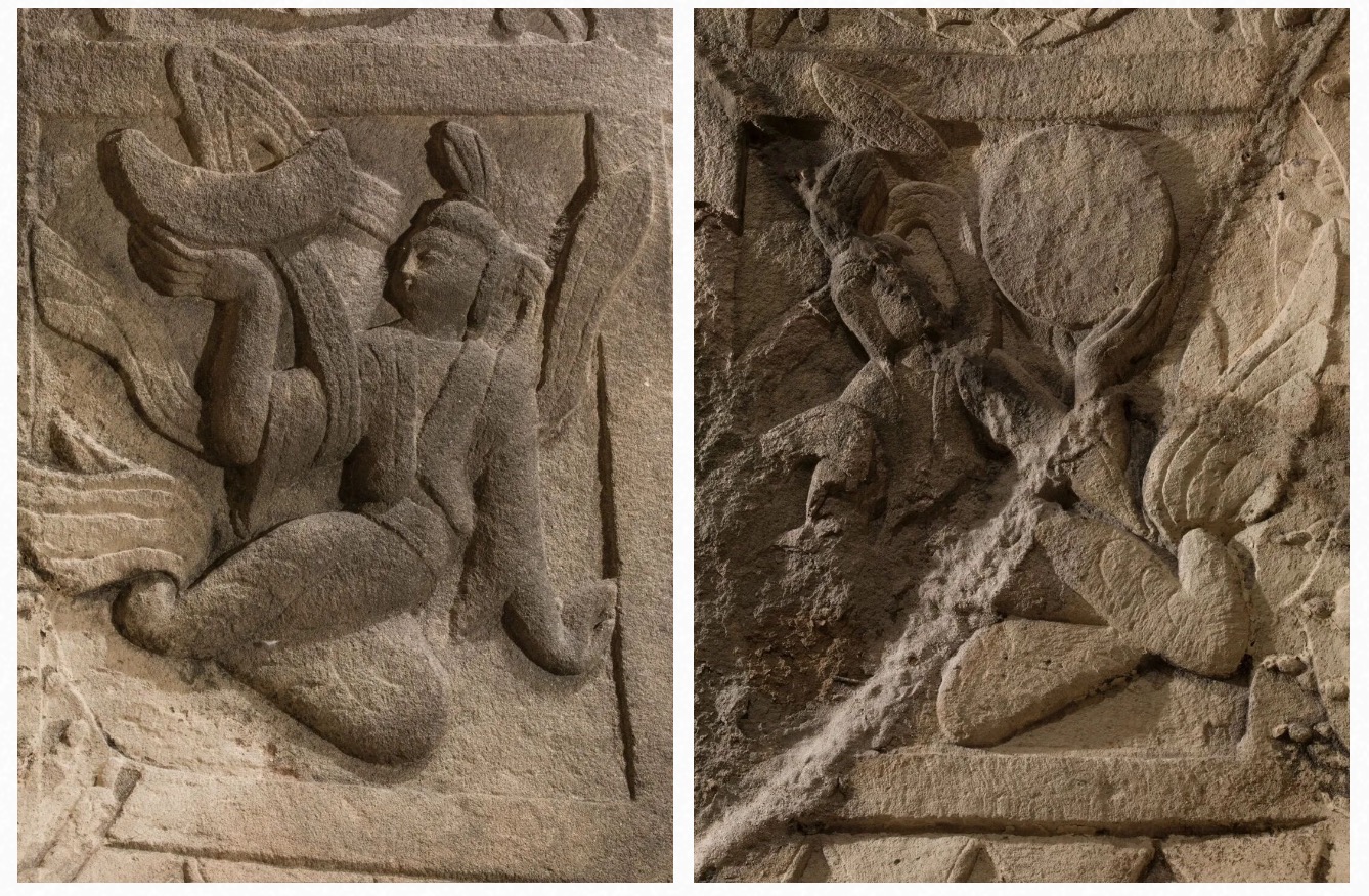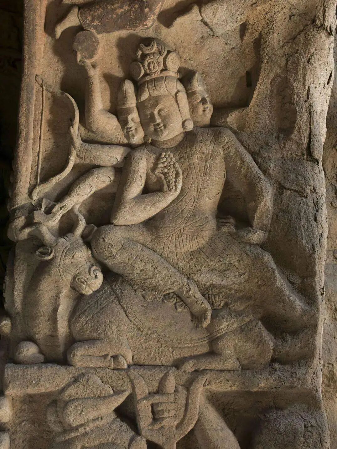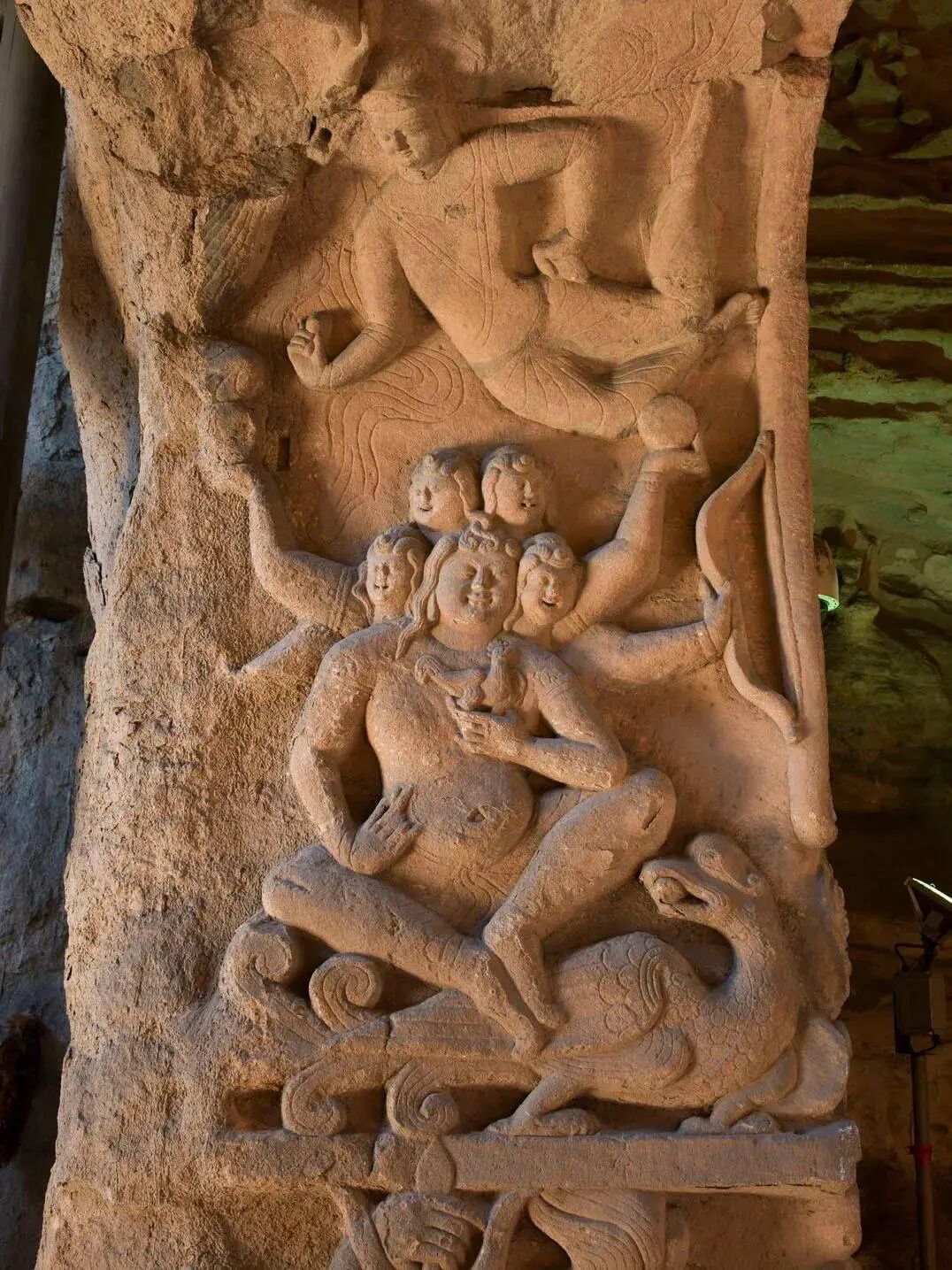 第8窟窟门西侧五头六臂的鸠摩罗天造像和东侧三头八臂的摩醯首罗天,是云冈石窟中“日月同现”的两尊代表性形象,其中“月”作为造像的重要装饰与神性象征,直接承载在神祇的手臂之上,象征护法祛邪。其中,鸠摩罗天乘着孔雀,其中一只手托举着日,另一只手托举着月,月亮以简洁的圆形造型呈现,与太阳对称分布,从另一种维度展现了云冈石窟对“月”元素的运用。