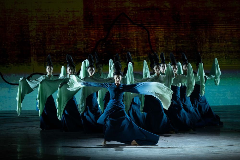 这是舞剧《唯我青白》的演出剧照(2024年8月16日摄)。该剧以器型为线索串联篇章结构,以中华传统美学引领创作,刻画了宋元时期青白瓷手工匠人的典型人物。