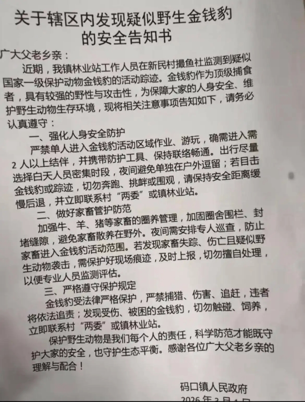 据网友发布的帖文,该《安全告知书》中写道:“近期,有人员在新民村撮鱼社监测到疑似国家一级保护动物金钱豹的活动踪迹。金钱豹作为顶级捕食者,具有较强的野性和攻击性。为保障群众人身安全、维护野生动物栖息环境,请大家强化安全防范意识,加强家畜管护,严格遵守野生动物保护相关法律法规。”