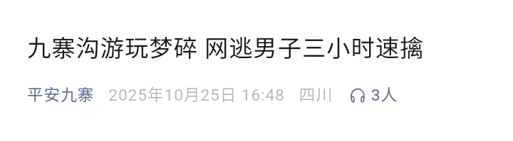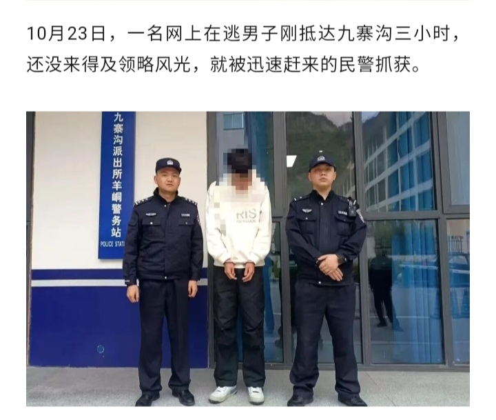10月23日,一名在逃男子刚抵达九寨沟3小时,还没来得及领略风光,就被迅速赶来的民警抓获。据悉,该男子因涉嫌盗窃罪,于2025年10月17日被江西南昌警方列为网上追逃人员。