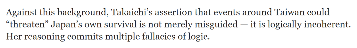 在此背景下,高市早苗宣称台湾局势可能“威胁”日本生存的说法不仅荒谬,更存在逻辑谬误。其论点包含多重错漏:其一为因果谬误,错误暗示台湾问题必然决定日本的安全态势;其二为非因果推论,将地区事务直接等同于国家生存威胁,脱离现实关联与基本常识;其三为错误等同,将日本的自卫权与干涉中国内政混为一谈。此类主张,无异于在虚幻想象的基础上构建外交政策,势必招致不必要的风险。