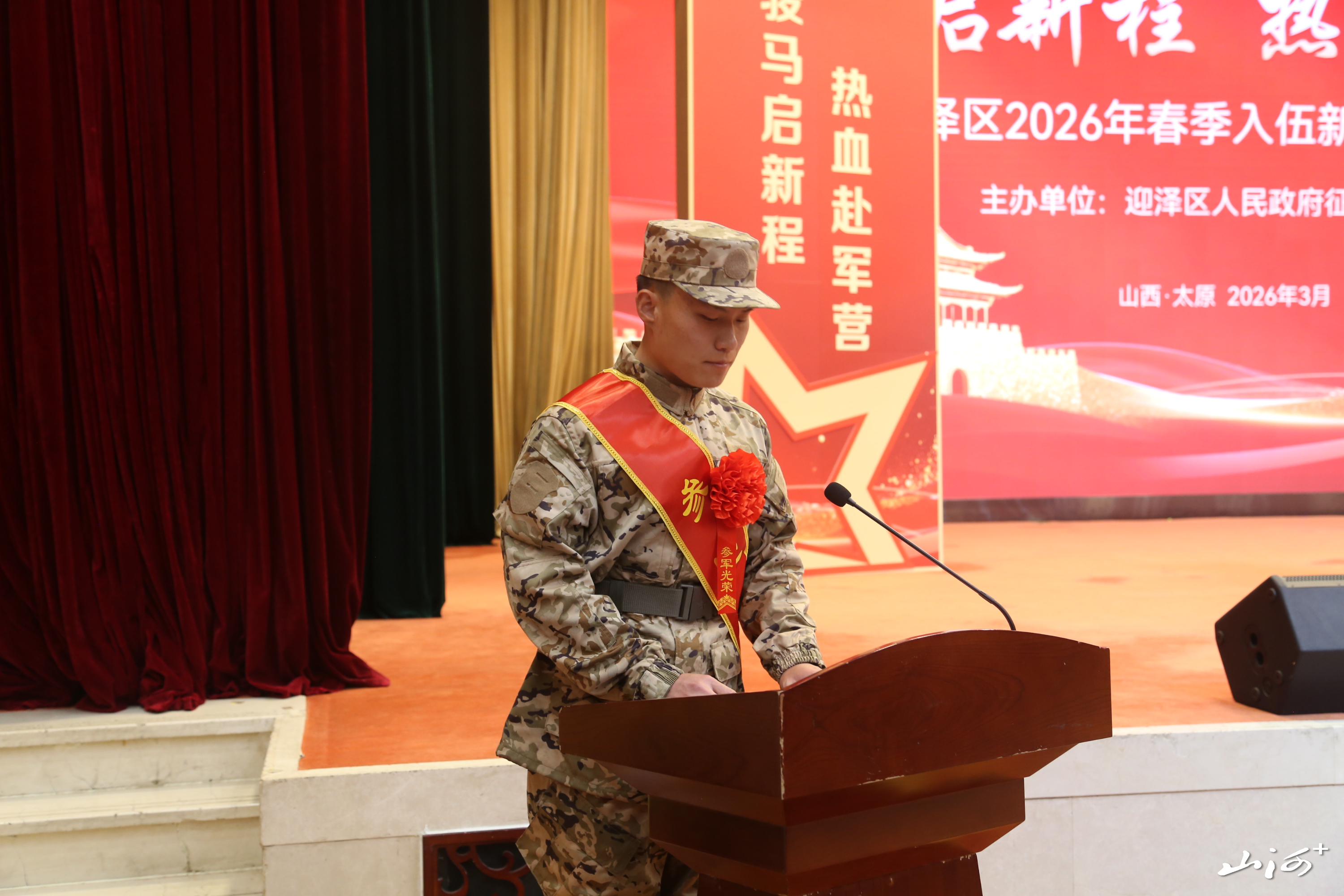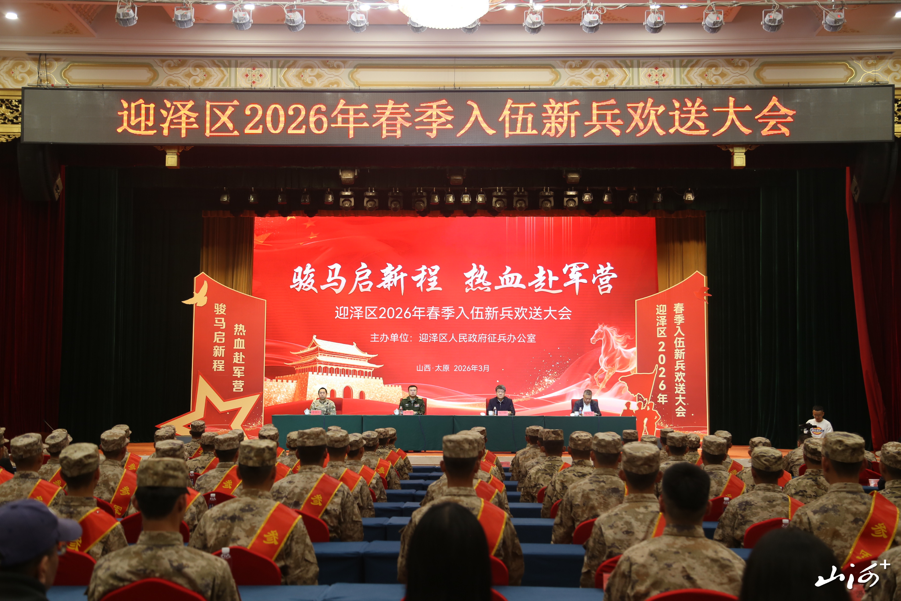 山西晚报·山河+讯    春风送暖,旌旗猎猎。2026年3月23日,太原市迎泽区2026年春季入伍新兵欢送大会在山西饭店隆重举行。大会以“骏马启新程,热血赴军营”为主题,将中国传统文化中的丙午马年元素融入现代欢送场景,通过庄重热烈的仪式为即将奔赴军营的新兵壮行。