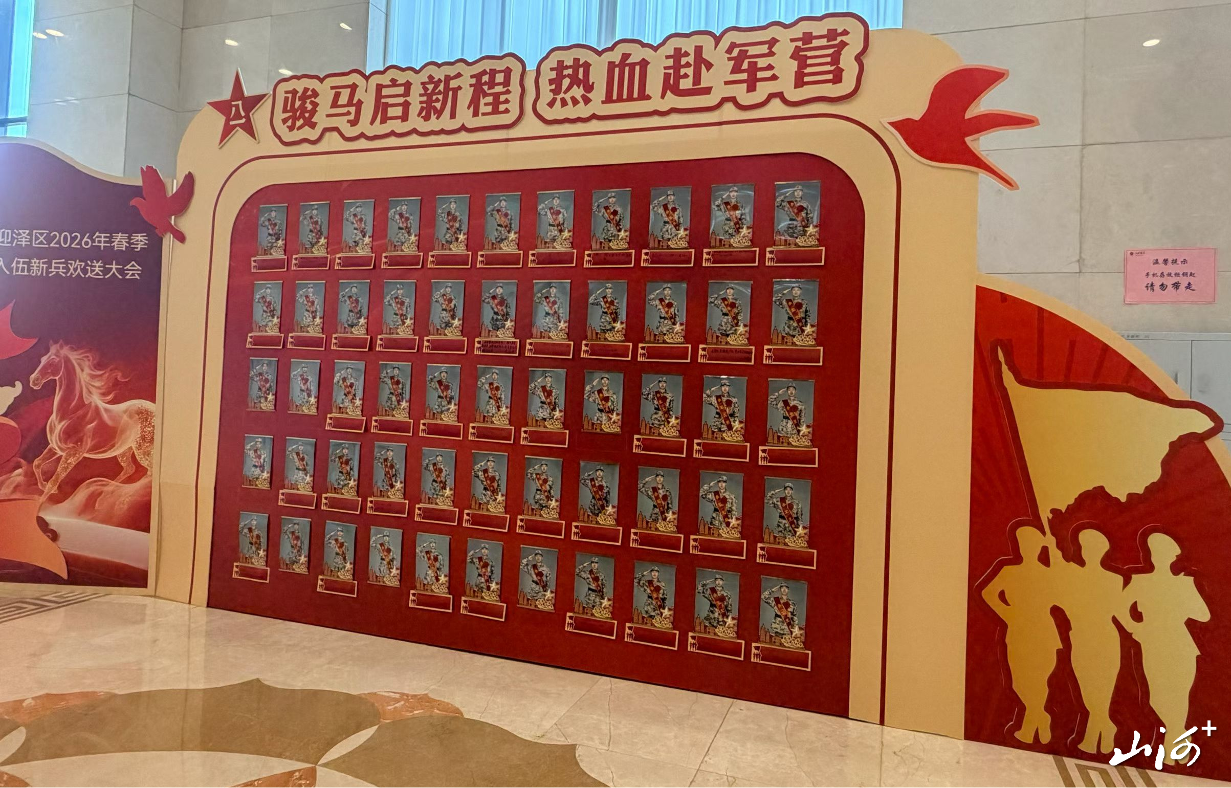 仪式最后,全体人员齐唱《中国人民解放军军歌》。仪式结束后,“骏马启新程,热血赴军营”主题照片墙前人头攒动、温情涌动。整面照片墙精心贴满了每位新兵身着戎装的定妆照,英气挺拔的模样与“策马扬鞭、矢志强军”的出征标语交相辉映。快门声此起彼伏,身披绶带、胸戴大红花的新兵们,与家人并肩站在照片墙前,将青春戎装与家国期许一同定格。一张张合影里,既有阖家团圆的温情瞬间,更有青年逐梦的热血担当,为这场庄重热烈的出征仪式,添上了最温暖动人的青春注脚。